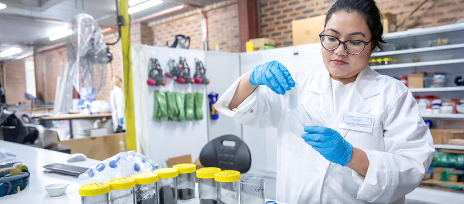 Lab technician undertaking critical minerals oxide quality control tests at the large experimental plant at Mawson Lake, South Australia, operated by the Adelaide University, a member of the ACMTC team.